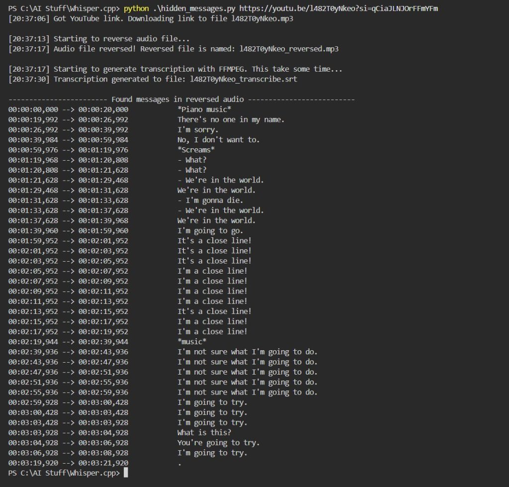 Kun tiedostosta on tehty takaperoinen versio, ajaa skripti tälle takaperoiselle tiedostolle FFMPEG:in ja käyttää siinä Whisperin kirjastoa jolla se generoi tekstitiedoston tiedoston sisällöstä.
