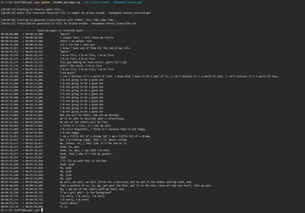 Lopuksi skripti vielä tulostaa näytölle generoidun tekstitiedoston tekstiosuuksien ja aikokoodien sisällön suhteellisen mukavasti luettavassa muodossa. Tämän jälkeen sitten voi itse lukea onko Whisperin tekoälymallin tunnistamissa lauseissa ja sanoissa yhtään mitään sellaista mitä kiinnostaisi kuunnella takaperin käännetystä audiotiedostosta. Mikäli on, voi sen jälkeen omalta koneeltaan ottaa tuon käännetyn audiotiedoston ja kelata siihen kohtaan missä Whisper analysoi jotain kuulevansa.