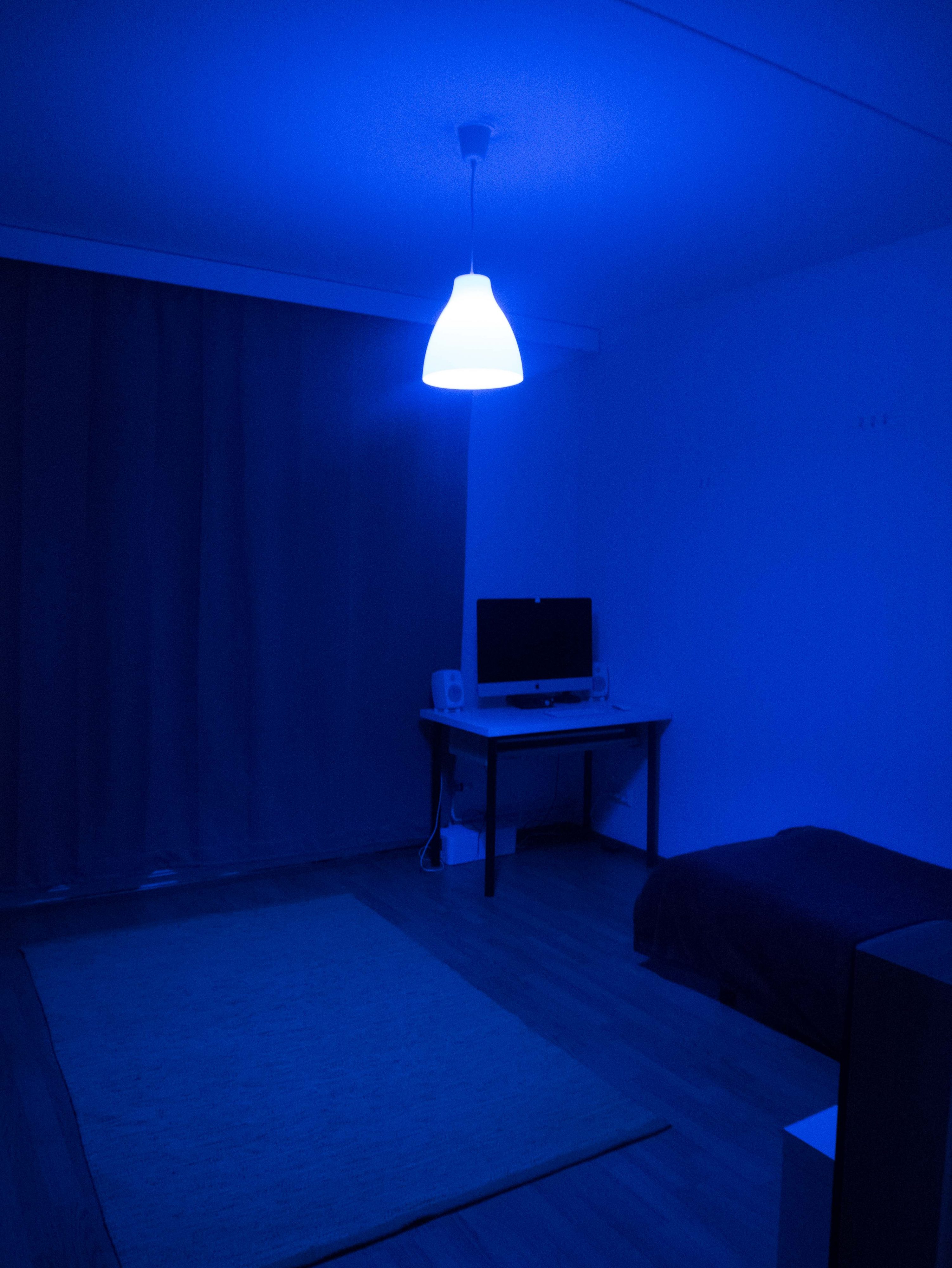 Kuten yllä olevasta kuvasta näkee, on myös makuuhuoneessa Hue-lamppu. Värisävyt onnistuu säätää myös tästä valasimesta mieleisekseen kännykkäohjelman kautta tai tietokoneelta erillisillä ohjelmilla. Pidän!