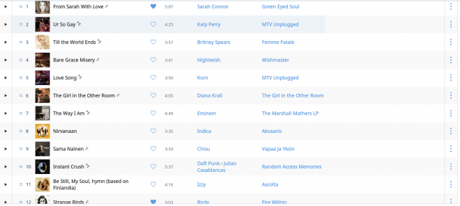 Testikappaleina toimivat alla olevassa kuvassa näkyvät biisit. Juuri ja juuri kappaleet mahtuivat kuvankaappaukseen sopivasti.