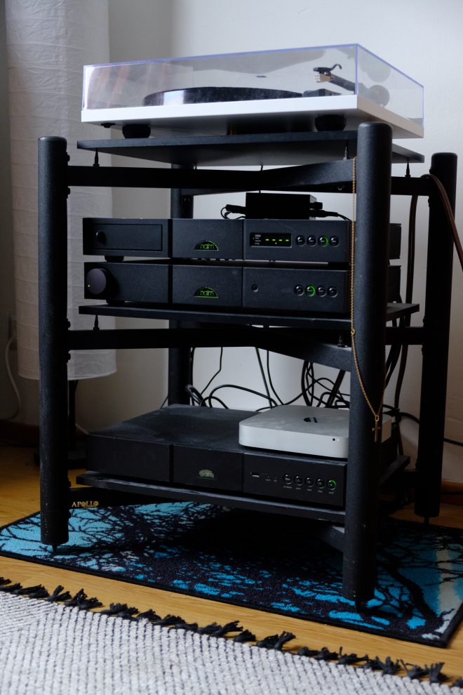 Yksi ratkaisu on ollut laittaa iPad Mini -tabletti kiinni telineen alimmassa osassa olevaan NAIM DACiin USB-liitännällä ja soittaa musiikit Roon-nimisellä ohjelmistolla. Tämä on ollut toimiva tapa, mutta ongelmana on ollut tietenkin se että toisinaan tabletin akku voi olla vähissä jolloin laite onkin pitänyt laittaa lataukseen.