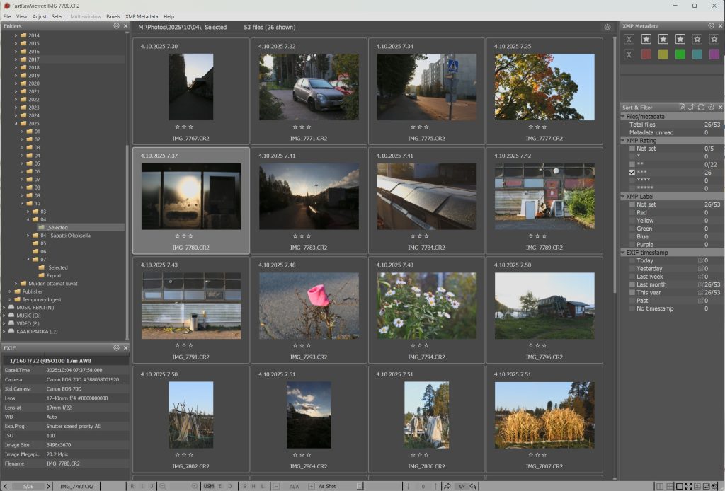 4. FastRawViewerillä kuvien selaaminen ja tähtien antaminen. Tämän vaiheen voi toistaa tarpeen mukaan useampaan otteeseen, eli ensin antaa nopeasti tähdet ja sen jälkeen filtteröi kuvat siten että näyttää vain ne kuvat joilla on 2 tai useampi tähti. Toisella kierroksella sitten tekee tarkemman valinnan, antaako tähtiä minkä verran.