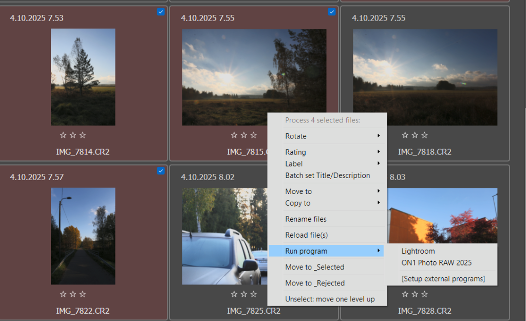 6. Tämän jälkeen valitsen kaikki kuvat _Selected-kansiosta ja valitsen niiden tuomisen Lightroom Classiciin. Tämän voi tehdä suoraan FastRawViewerissä.