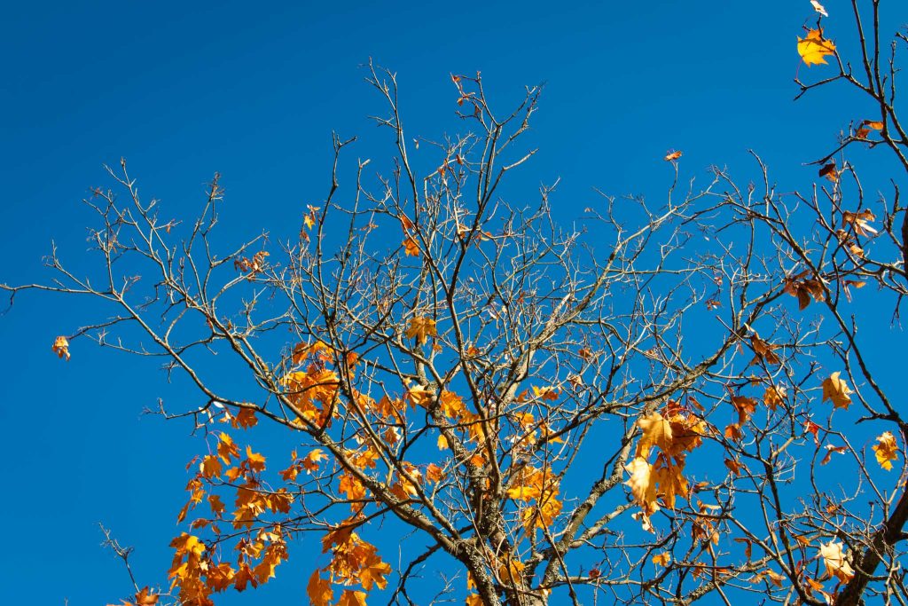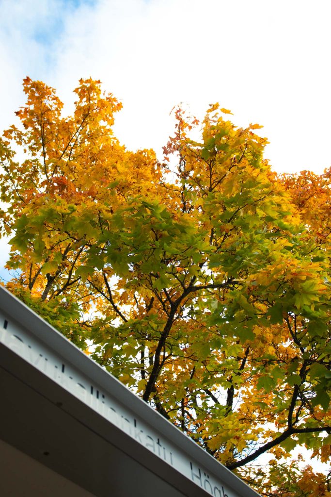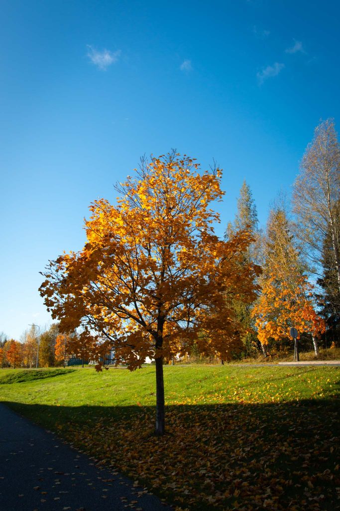 Syksyn väreissä oleva puu jonka lehdet ovat alkaneet jo putoamaan maahan. Kuva otettu Vantaan Ilolassa 10.10.2025.